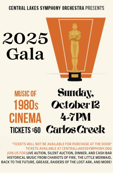 Join us for an upscale evening of food, silent and live auction items, and – most importantly – live music. Our annual Central Lakes Symphony Gala welcomes guests to Carlos Creek. This year, our orchestra presents the timeless and thrilling music of 1980s Oscar winning films. 1980s costumes are encouraged.